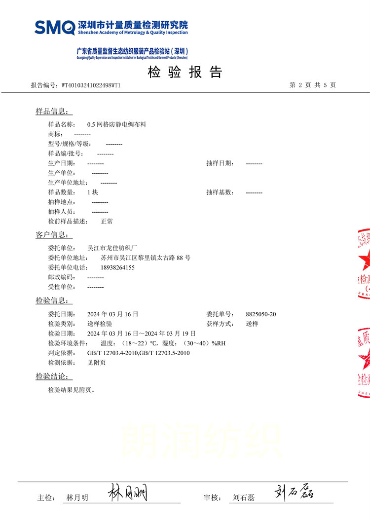 0.5網格防靜(jìng)電(diàn)綢布料-檢驗報(bào)告